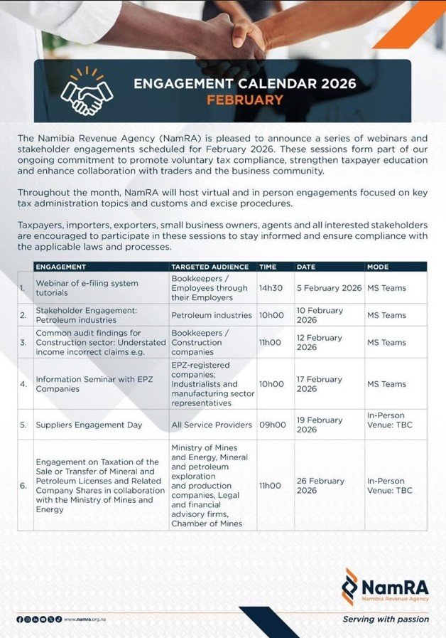 NamRA has released its February 2026 calendar of tax and customs engagements, including webinars and in-person sessions covering e-filing, audits, EPZ incentives, and sector-specific tax issues.