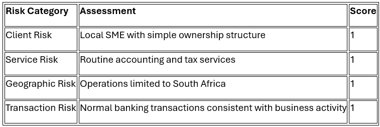 This example illustrates how a structured risk model helps firms apply the risk-based approach required by the FIC Act in a practical and defensible way. Instead of assuming that every client represents a high risk, the firm uses objective criteria to determine the appropriate level of scrutiny.