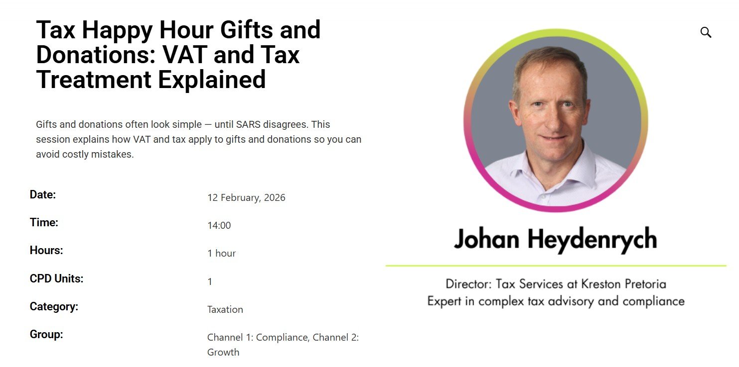 Join Johan for the CIBA’s Tax Happy Hour Gifts and Donations: VAT and Tax Treatment Explained