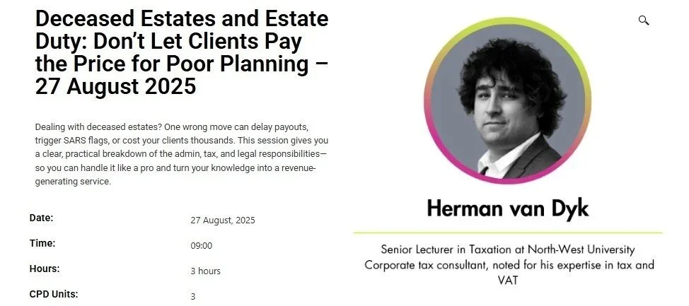 Master the estate administration processes and help your clients through these tough times. Enroll to CIBA’s live webinar on 27 August 2025 on Deceased Estates and Estate Duty: Don’t Let Clients Pay the Price for Poor Planning.